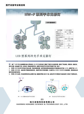搜索同种产品商品名 无影灯 英文名称 科室分类 手术室/ICU 产品分类 医疗器械/手术室、诊疗室设备 批准文号 主要规格 LED 包 装 价 格 用 法 用 途 我厂LED芯片由美国科瑞公司定制,以LED为发光源,拥有了真正冷光源效果,提高了高演色、高聚光、低眩光、 产品说明 我厂LED芯片由美国科瑞公司定制,以LED为发光源,拥有了真正冷光源效果,提高了高演色、高聚光、低眩光、 高均匀度、低电磁干扰、长寿命、耗电低等特性,是取代传统手术无影灯的新产品。特点: 1、采用LED作为手术无影灯的光源,节能效果显著在同等亮度时的能耗仅为普通白炽灯的1/10,卤素灯泡1/2. 2、采用LED芯片,通过电子数码控制系统,亮度可进行无极调控,色温可从3500-5000K任意调整,帮助医生准 确识别备组织结构。 3、采用LED光源,灯泡使用寿命比卤素灯泡(德国欧司朗)高50倍,避免手术中更换灯泡的麻烦,降低了使用成本。
